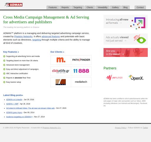 ADMAN – the leading Ad serving platform in Greece, is a state-of-the-art managing, delivering and monitoring targeted advertising campaigns web-service. Our customers enjoy the platform’s key features, including our adaptability with all advertising forms and media, targeting based on over 36 criteria, top-notch stock management, simple and direct adjustment of campaigns, absolute real-time reports and user-friendly banner setup.